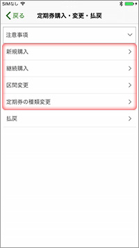 - チケット購入・Suica管理画面で「定期券」をタップします。