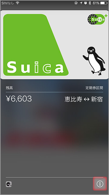 - Wallet内のApple Payで定期券を継続発行するSuicaを表示し、画面右下の「i」ボタンをタップします。