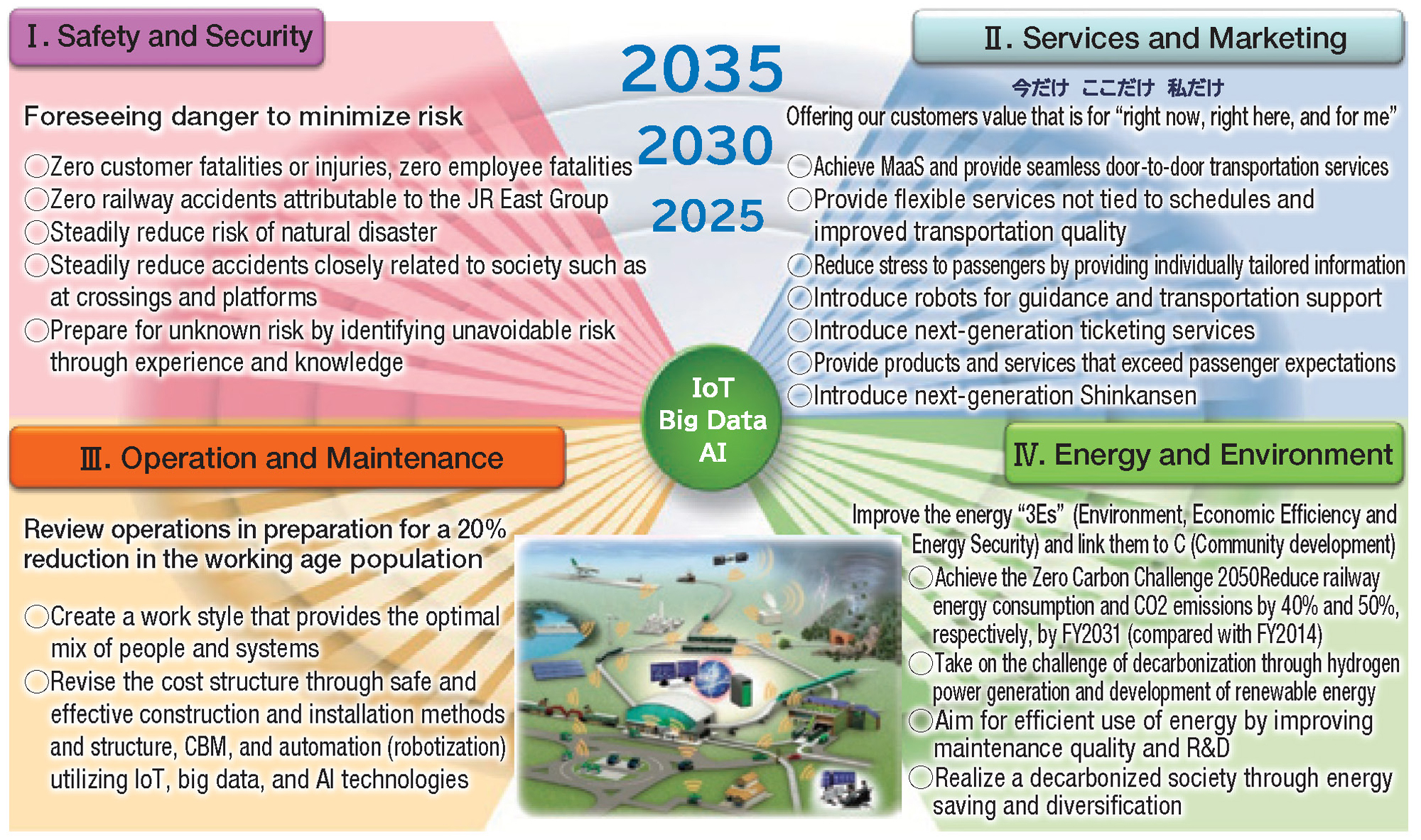 In the four areas of safety and security, service and marketing, operation and maintenance, and energy and the environment set forth in our Mid-to-Long-Term Vision for Technological Innovation, we leverage tools such as IoT, big data, and AI to aim to create new value through pioneering technological innovation. In particular, we are focusing on resolving management and frontline issues that the JR East Group faces, such as the declining working age population, energy and environmental issues, and measures to deal with increasingly severe natural disasters.
