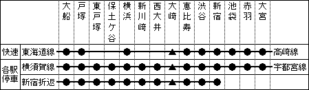 データイムの直通運転本数は1時間あたり、新宿を挟んで大宮方面2往復、横浜方面3往復となります。 |
