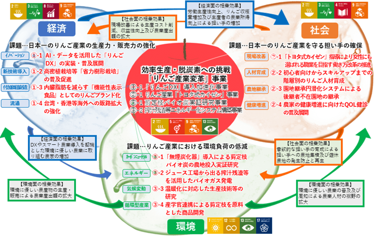 これらの課題を解決するために、弘前市は日本の市町村で唯一の「りんご課」を設立しました。弘前市の主産業であるりんご産業の振興のため、生産から加工・流通・販売に至るまでりんごに特化した事業を展開することを目的としています。文化やシビックプライドとしても重要な「日本一のりんご産業」を将来も持続可能とするため、これまで積み上げてきた「りんご産業イノベーションン」の土台をベースに、SDGsで切り拓く持続可能な「日本一のりんご産地」の実現プロジェクトを提案し、令和5年5月、県内で初めて「SDGs未来都市」、北東北3県で初めて「自治体SDGsモデル事業」に選定されました。