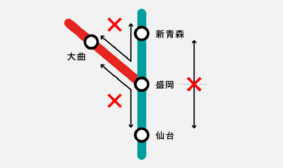 ※大宮駅で小山駅方面と熊谷駅方面、高崎駅で上毛高原駅方面と安中榛名駅方面、越後湯沢駅で浦佐駅方面とガーラ湯沢駅、盛岡駅でいわて沼宮内駅方面と雫石駅方面を乗り継ぐ場合も同様にご利用できません。