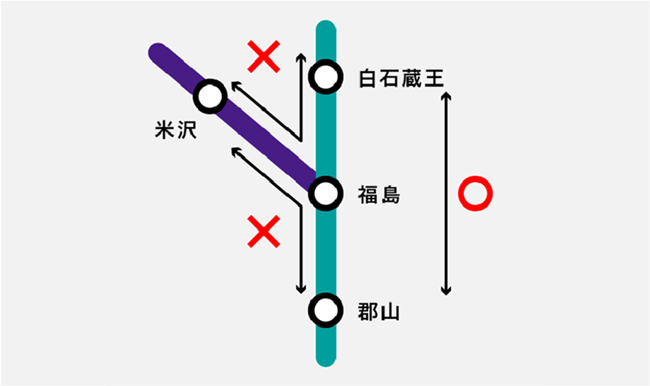 ※福島駅をまたがった区間のご利用については、郡山方面と白石蔵王方面は通しでご利用いただけますが、郡山方面と米沢方面をまたがってご利用いただくことはできません。(東京~米沢など)