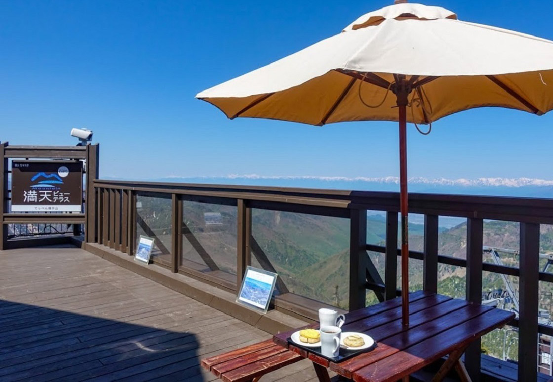 日本最高地点のテラスが「横手山満天ビューテラス」。標高2,307mから、晴れた日には、富士山、木曽駒、乗鞍、北アルプス、白馬、妙高の山々の絶景が望めます。