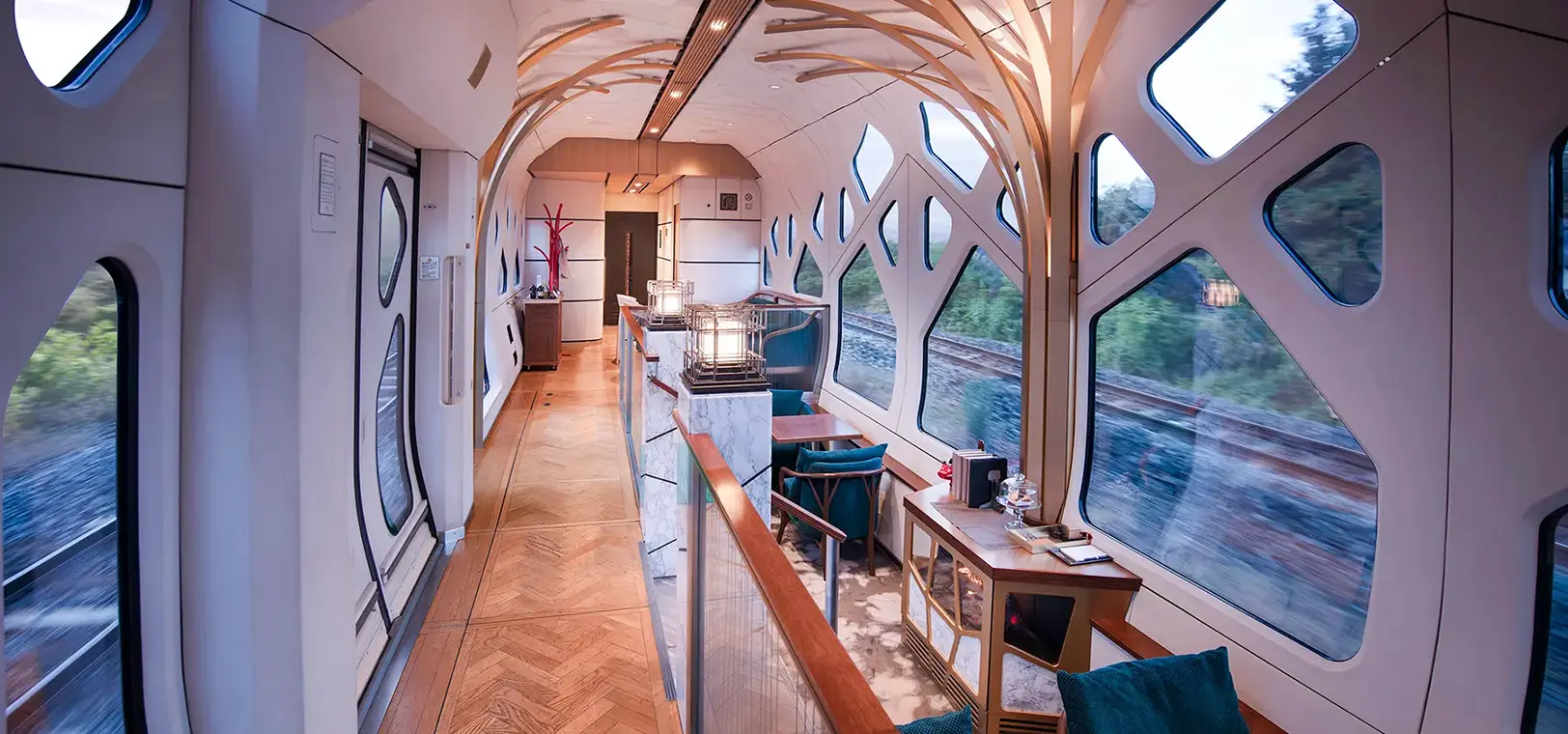 「TRAIN SUITE 四季島」では、車窓から見える風景もまた美しい旅の舞台。その特等席ともいうべき場所が、先頭と最後尾に配された展望車両「VIEW TERRACE きざし・いぶき」です。