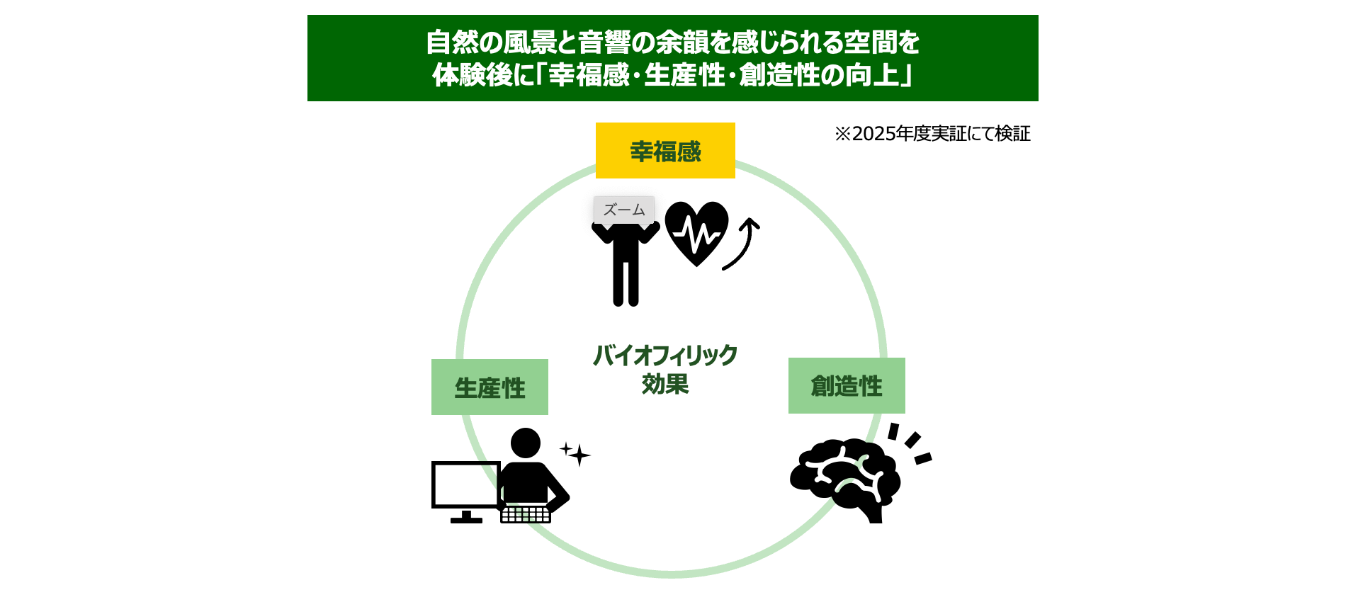 - 日々多忙でストレスを抱えがちな都市生活者に、自然の癒しを提供することで、生産性、創造性を向上させ、幸福感の提供を目指す。