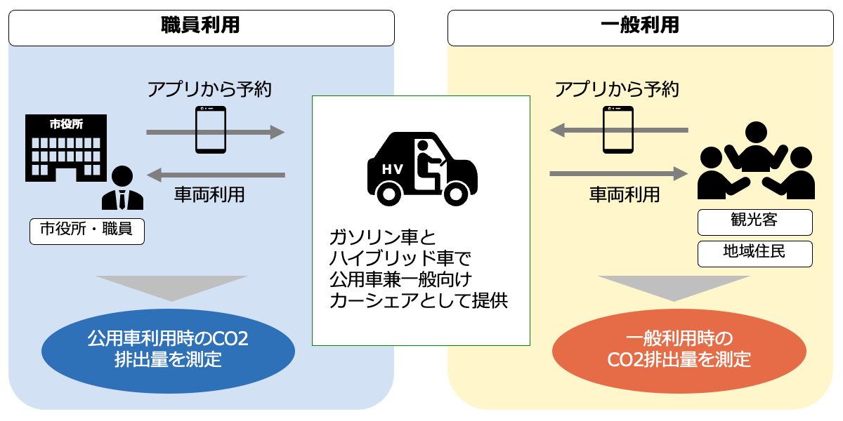 - 公用車をカーシェアとして一般に開放することで、それぞれの使い方でCO₂排出量を測定、ハイブリッド車の導入効果を算出し、ハイブリッド車置換えの指標を試作する。また、カーシェアの観光促進等への影響を検証する。