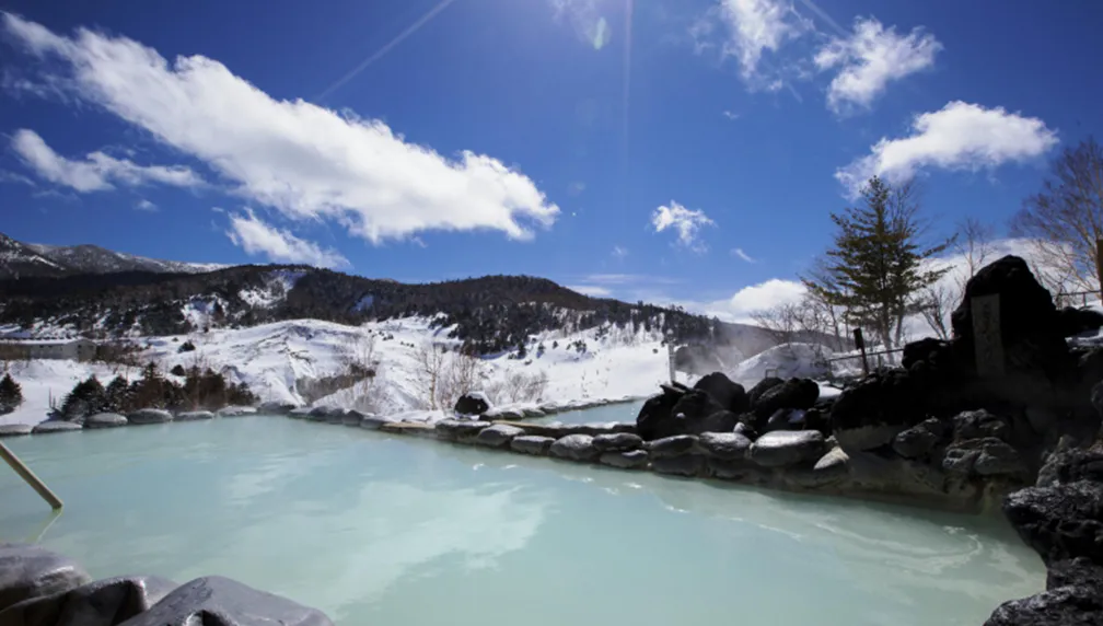 粉雪舞う標高1,800mの万座で、山々に包まれる絶景と極上のにごり湯を満喫。石座温泉の魅力あふれるひとときを、心ゆくまで体感しよう。