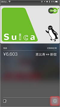 Wallet内のApple Payで定期券を継続発行するSuicaを表示し、画面右下の「i」ボタンをタップします。
