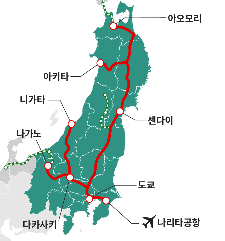 예) 나리타공항역을 출발하여 도쿄역을 경유해서 센다이 및 아오모리를 여행할 경우