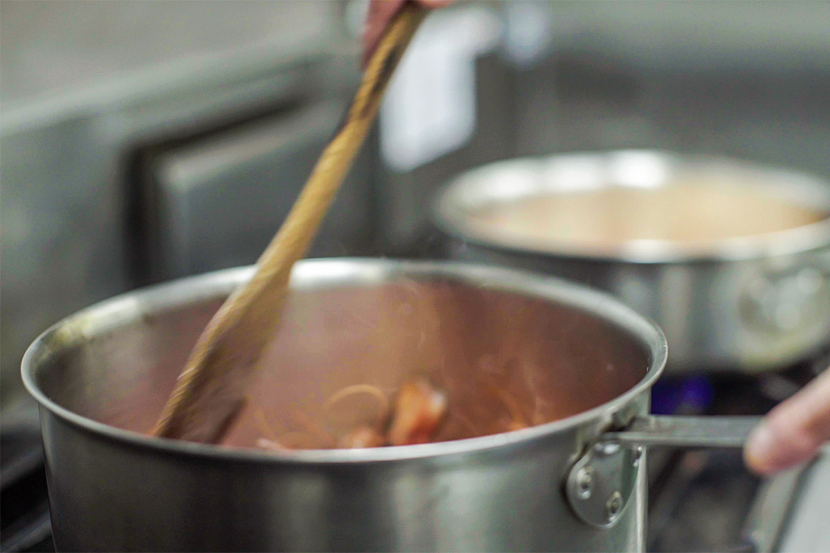 昨年(2018年)まで務めていた東京ステーションホテルでは、フランスのレストラン厨房を経験する半年間の研修がありました。この経験は、自分にとってフランス料理を見つめ直す貴重な機会になりました。研修先のひとつである、パリの「ル・グラン・ヴェフール」と「タイユヴァン」は、正統派フランス料理を重んじつつ、最前線を追究している名店です。フォンにしてもブイヨンにしてもしっかりしたものをベースに、そこに新たな感性で肉づけしていくことの大切さを改めて学び直しました。