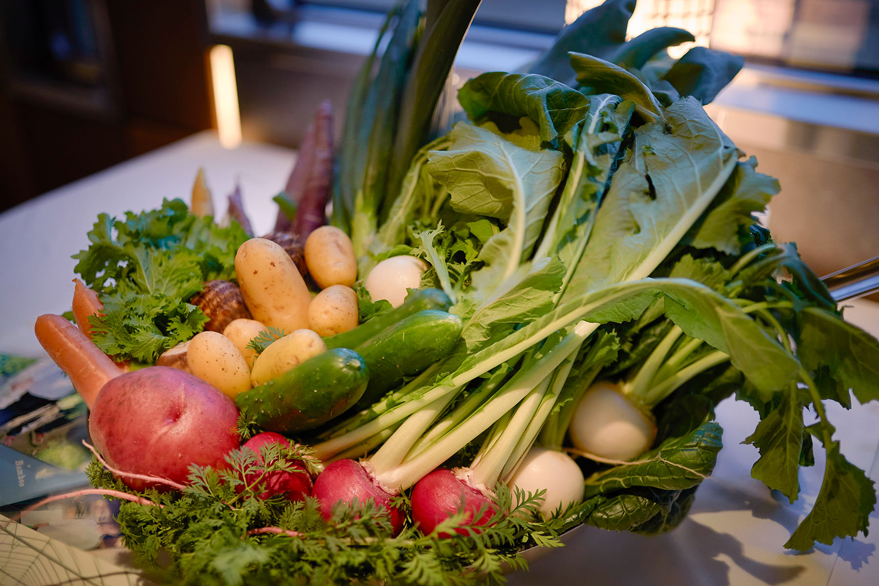 就任が決まってから、東日本各地を訪ねて生産者の方々にお会いし、新たな食材の見直しを続けてきました。前職の「ホテルメトロポリタン 丸の内」の時代にも、東日本の豊かな食材に刺激を受けてきましたが、まさに海山の食材の宝庫だとつくづく感じました。その土地固有の気候と土壌の力、そして多彩な食材と生産者の方々との出会い。それは驚きと感動の経験でした。たとえばその味わいに感動したのは、栃木・下野市の海老原ファームの野菜です。とにかく味が濃厚で、野菜の力が溢れています。旬のとれたてを直送していただき、サラダなどにして、あえてドレッシングなどは控えめにしています。