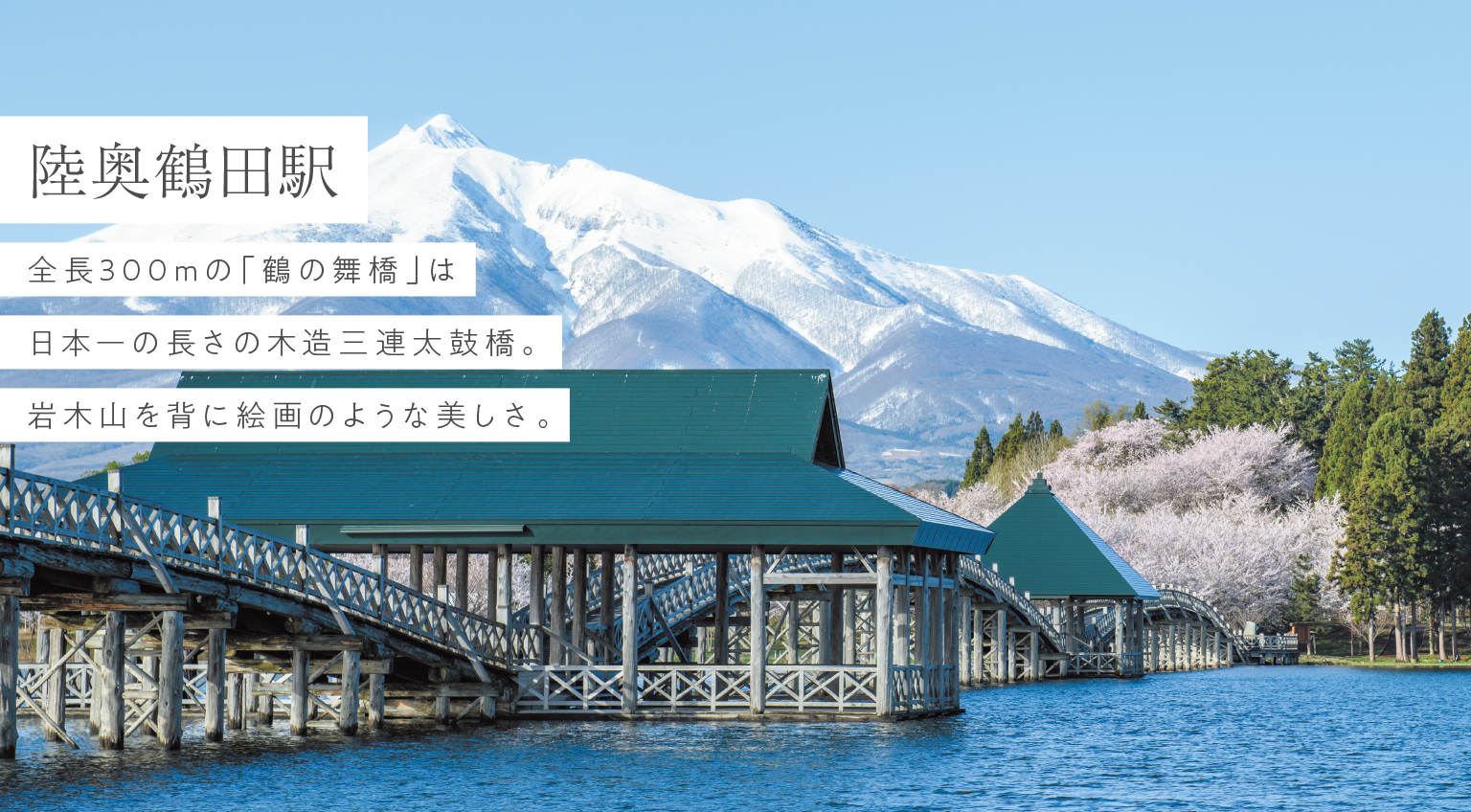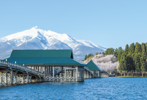 津軽富士見湖(廻堰大溜池)に架かる、全長300mの日本一長い木造三連太鼓橋。長い木の橋・長生きの橋として、この橋を渡ると長生きできるとも言われる。