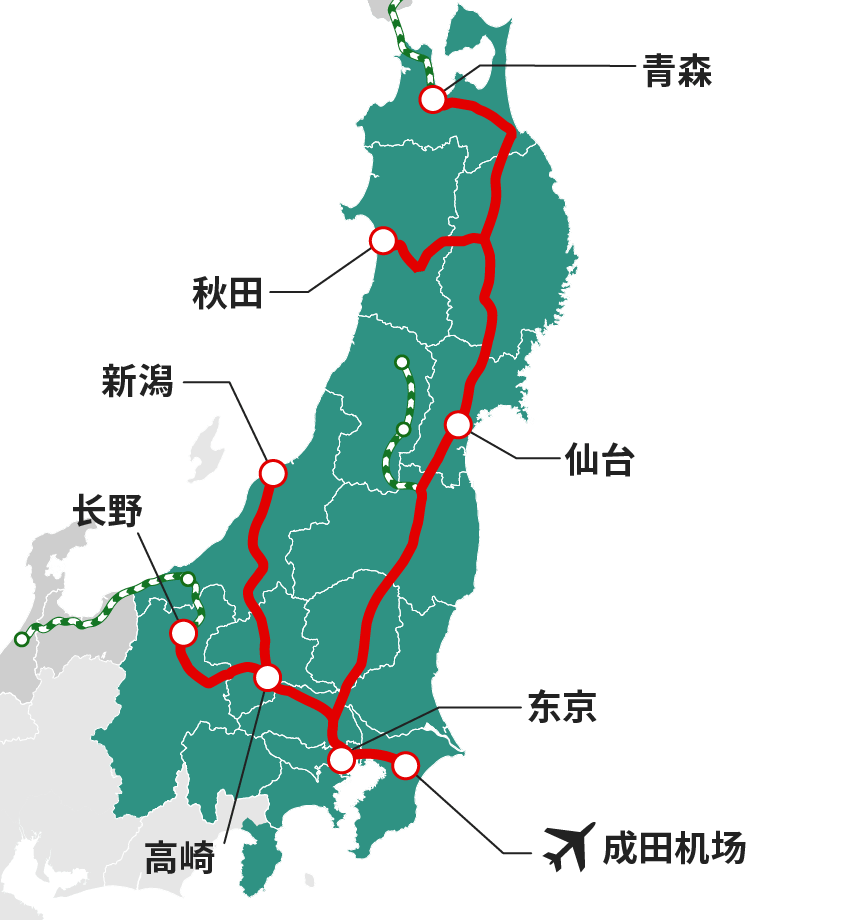 例)从成田机场出发经由东京站前往仙台・青森旅行