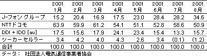 日本テレコム は日本の大手通信企業であり、急成長を遂げている移動体通信会社J-フォングループの親会社でもあります。ユーザー数において世界第3位の移動体通信市場である日本において、J-フォングループは2001年8月31日現在1,090万人の加入者数、約16.9%の市場シェアを持つ、国内第3位の移動体通信事業者です。また、J-フォングループ は2000年6月に次世代携帯電話の免許も取得し、2002年6月からサービスを開始する予定になっています。次世代携帯電話の商用サービスは、日本において世界で最初に開始される予定です。今年の8月31日現在、J-フォングループはJ-スカイ・サービスを通じて830万以上のモバイルデータ ・ユーザーを持ち、データ通信加入者が全体の移動体通信加入者に占める割合においては国内事業者第1位となっています。J-フォン加入者の月間ARPUは、2000年度(2000年4月から2001年3月)は7,700円で、ボーダフォン グループ内においても最大となっています。