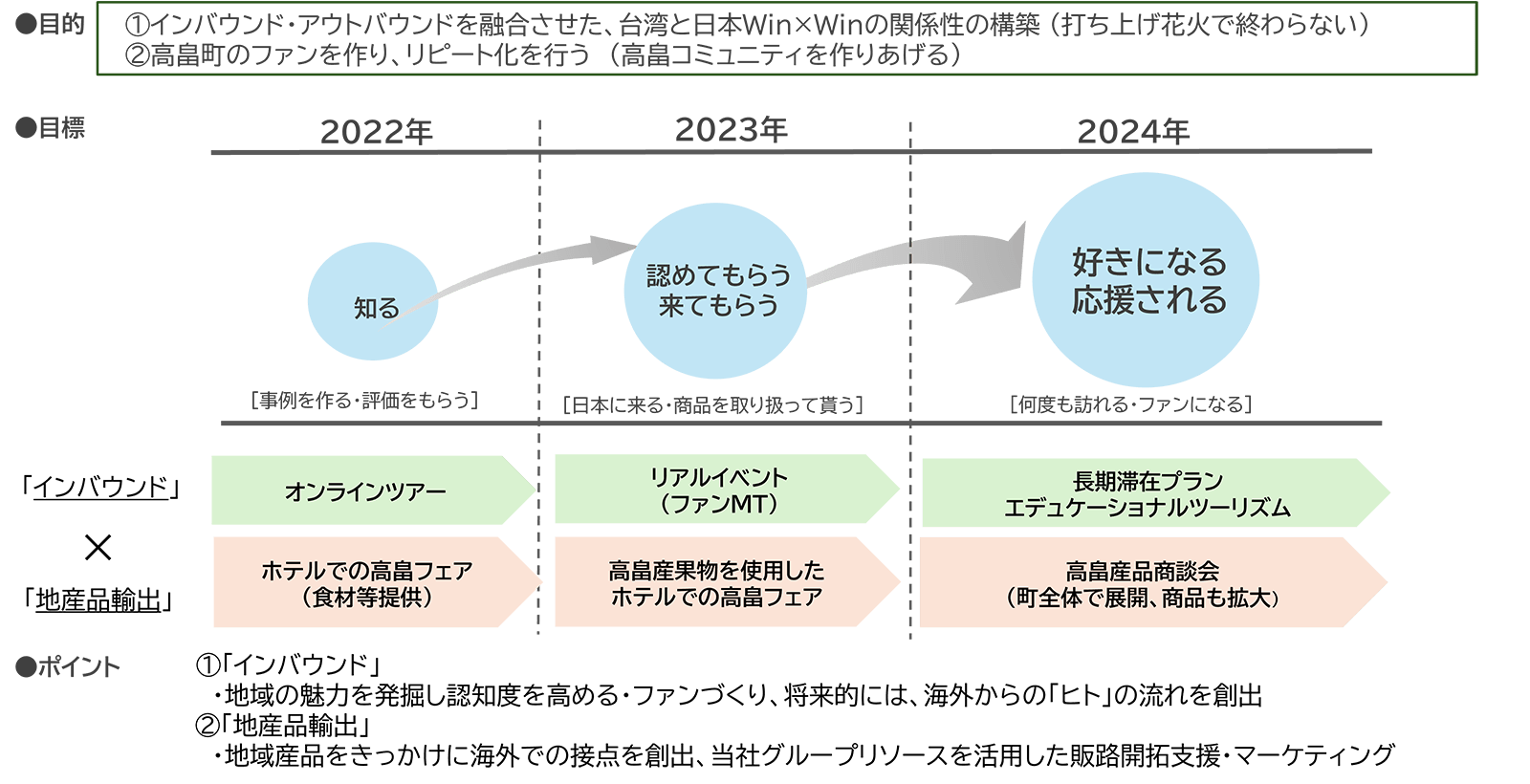 我々が掲げた事業テーマは、インバウンドと地産品輸出の掛け算により、ヒトとモノの流れを創出し、高畠ファンを増やすことです。交流人口よりも深く関わり、関係人口よりももう少しライトな関係性、それを高畠ファンと定義しています。
