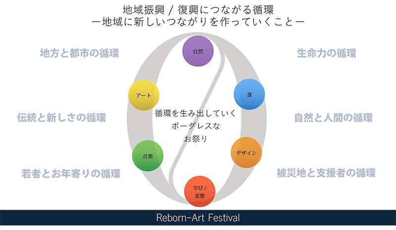 一般社団法人Reborn-Art-Festivalは、食・現代アート・音楽を三本の柱とする「Reborn-Art-Festival」という総合芸術祭を運営する事務局の法人です。東日本大震災をきっかけとし、持続可能な復興と地域振興をアジェンダとして動き出した事業です。本祭で多くの方にご参加いただくことはもちろんのこと、定常的に賑わい、活躍の場、外との交流をつくり、持続可能な形で循環をつくることを目指しています。