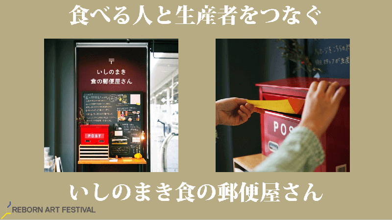 上記の鹿肉やインディーズフィッシュであるイシガニを活用して、おでんとタコスを提供しています。石巻では200種以上水揚げされ、良くも悪くも豊富な食材のある石巻。たくさんある食材をおだし、またはくるむこと=おでんとタコス 単に飲食店として美味しいものを提供するだけでなく、食べる人と生産者をつなぐ「いしのまき食の郵便やさん」食べた方の感想、生産者からのレターを展示している。石巻とアートをつなぐ。アートのワークショップや展示を行っています。