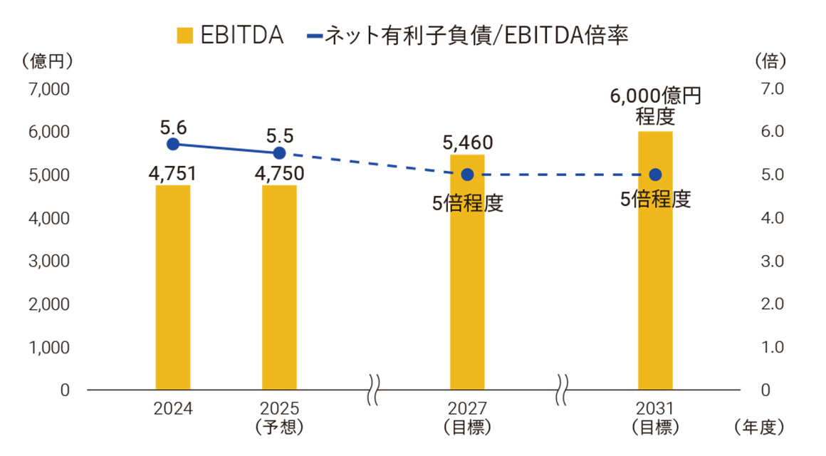 当面は有利子負債が増加する計画ですが、稼ぐ力も着実に高めていきます。稼ぐ力と有利子負債のバランスをコントロールしながら、ネット有利子負債/EBITDA倍率は5倍程度をめざす方針とし、成長加速と財務健全性を両立していきます。